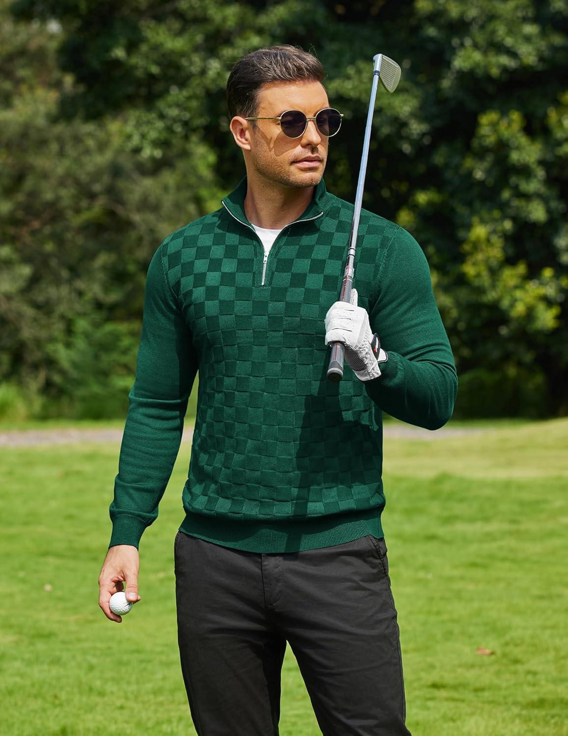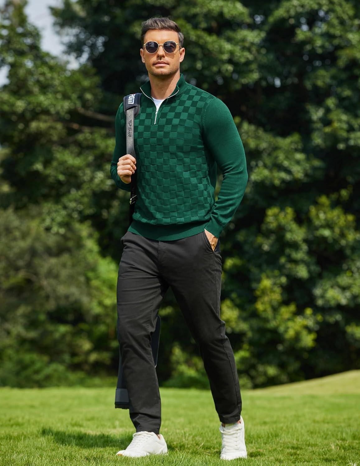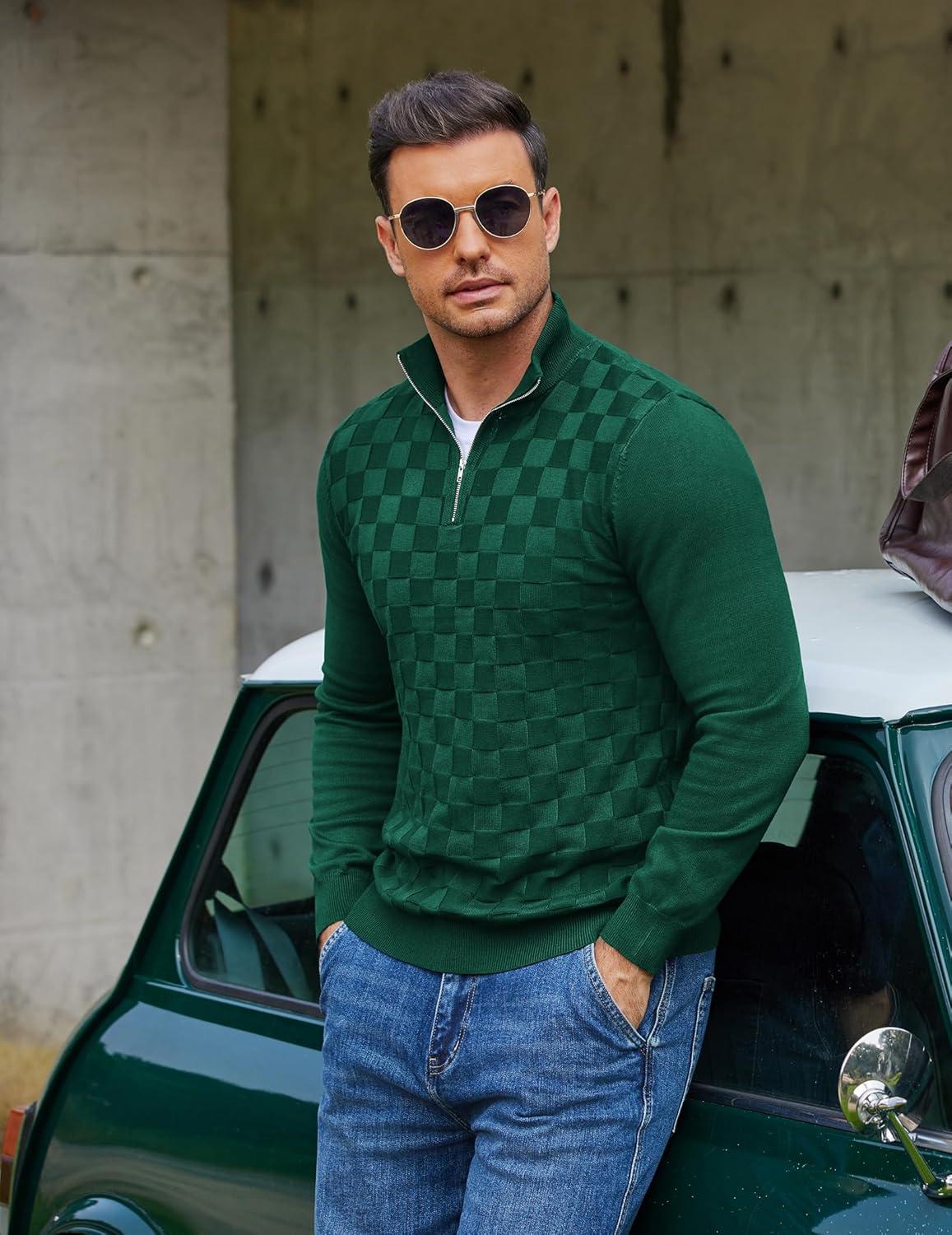 COOFANDY Quarter Zip Pullover Men Dress Sweaters Long Sleeve Jacquard Checkered Sweater(Green)