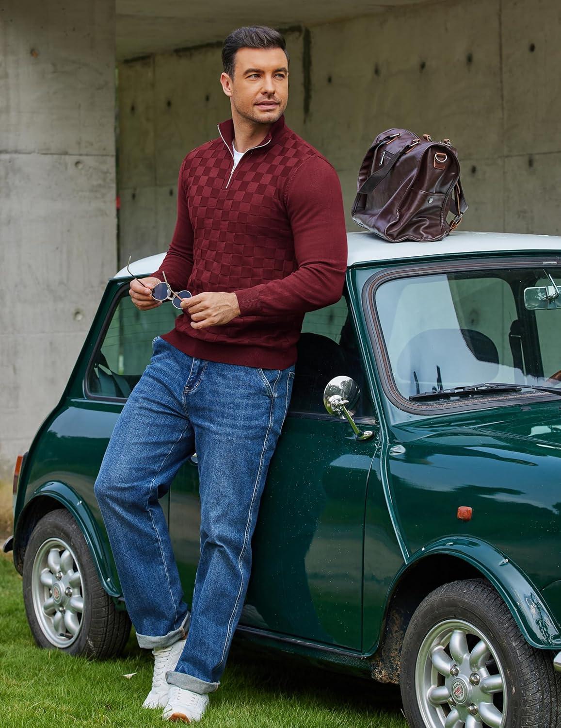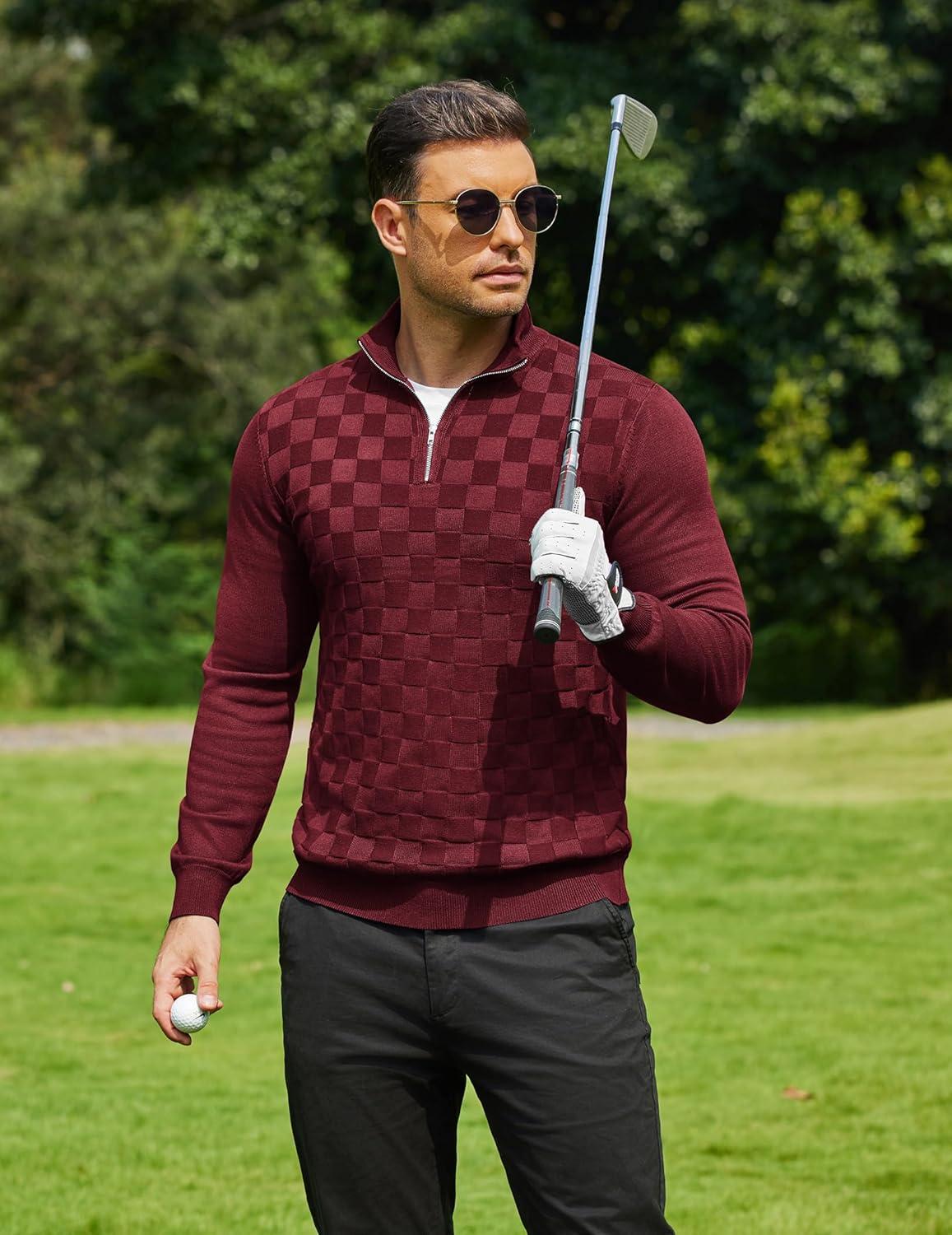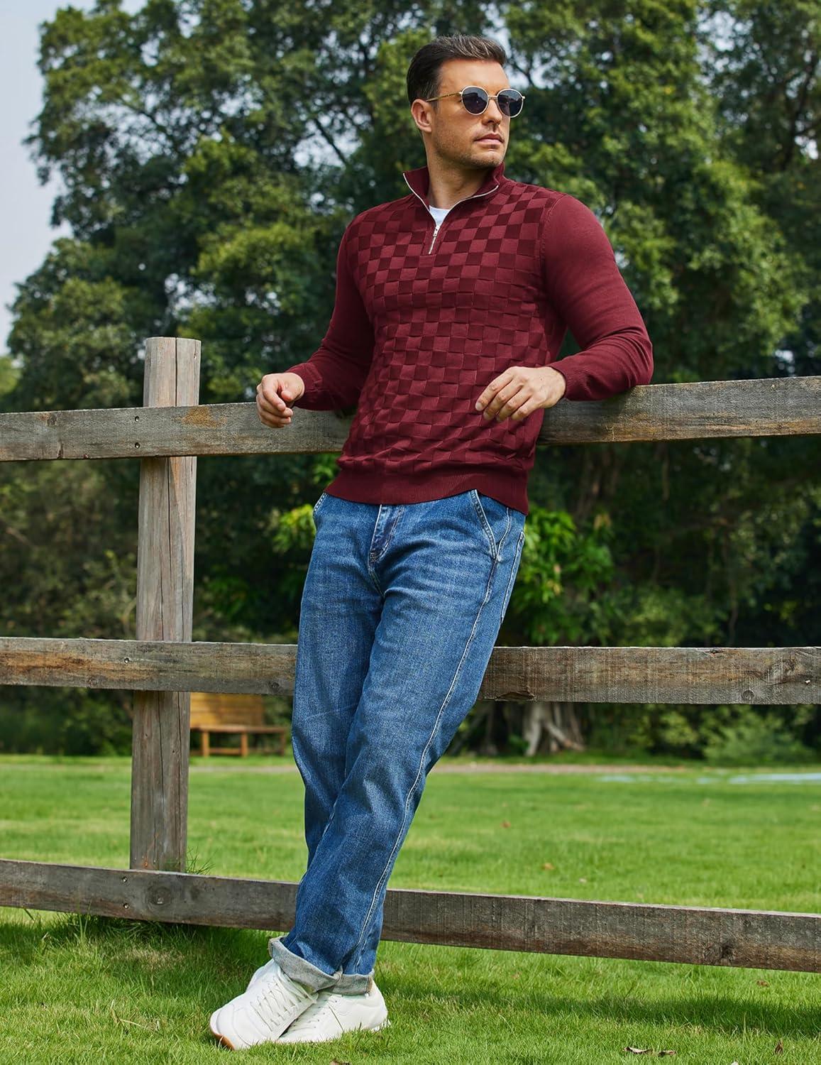 COOFANDY Quarter Zip Pullover Men Dress Sweaters Long Sleeve Jacquard Checkered Sweater(Wine Red)