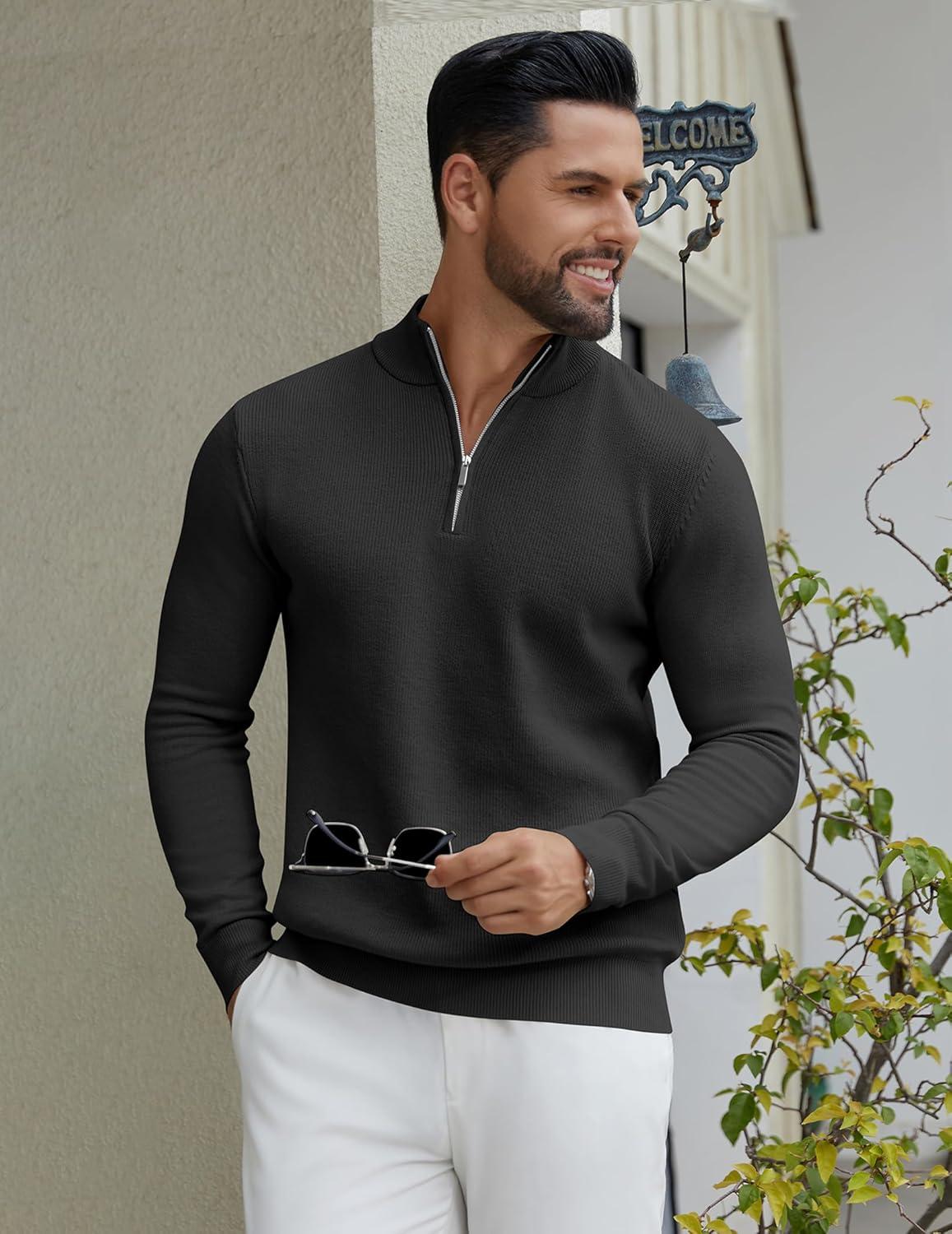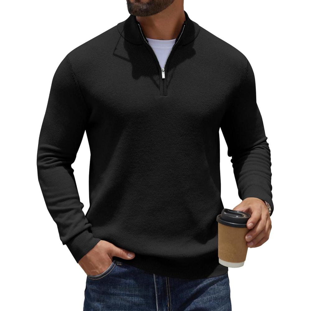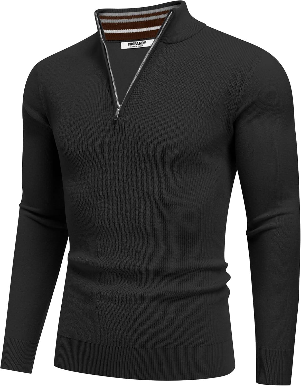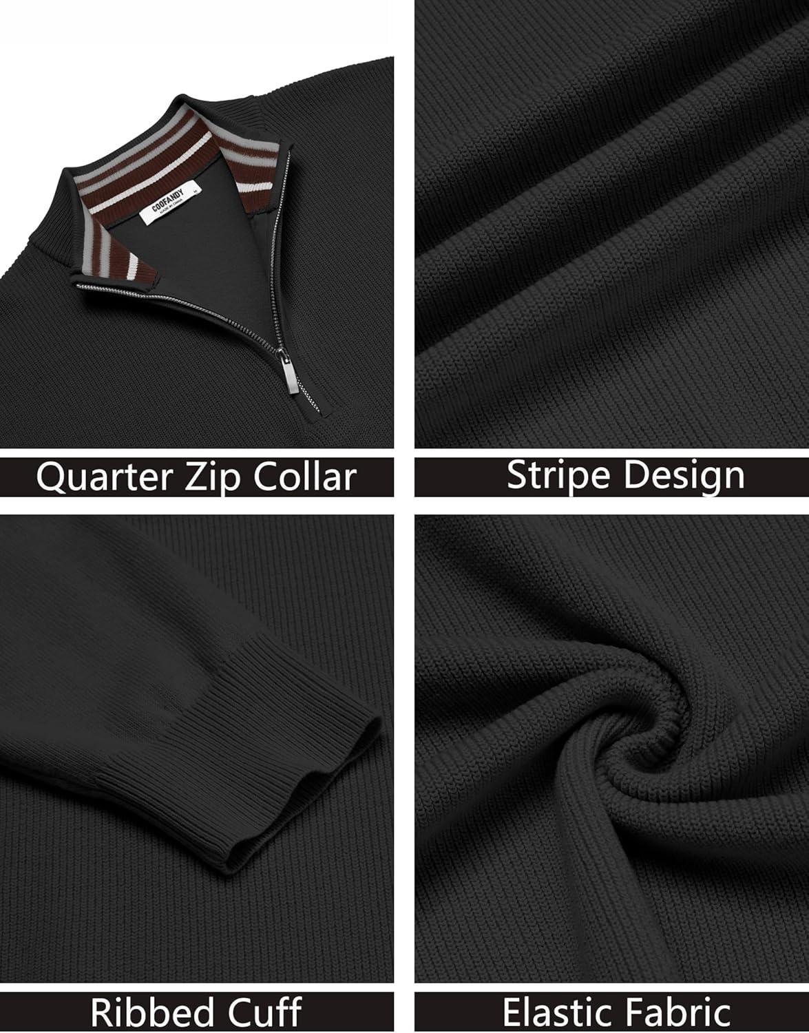 COOFANDY Quarter Zip Pullover Men Slim Fit Stretchy Ribbed 1/4 Zip Sweaters Business Casual Sweater(Black)