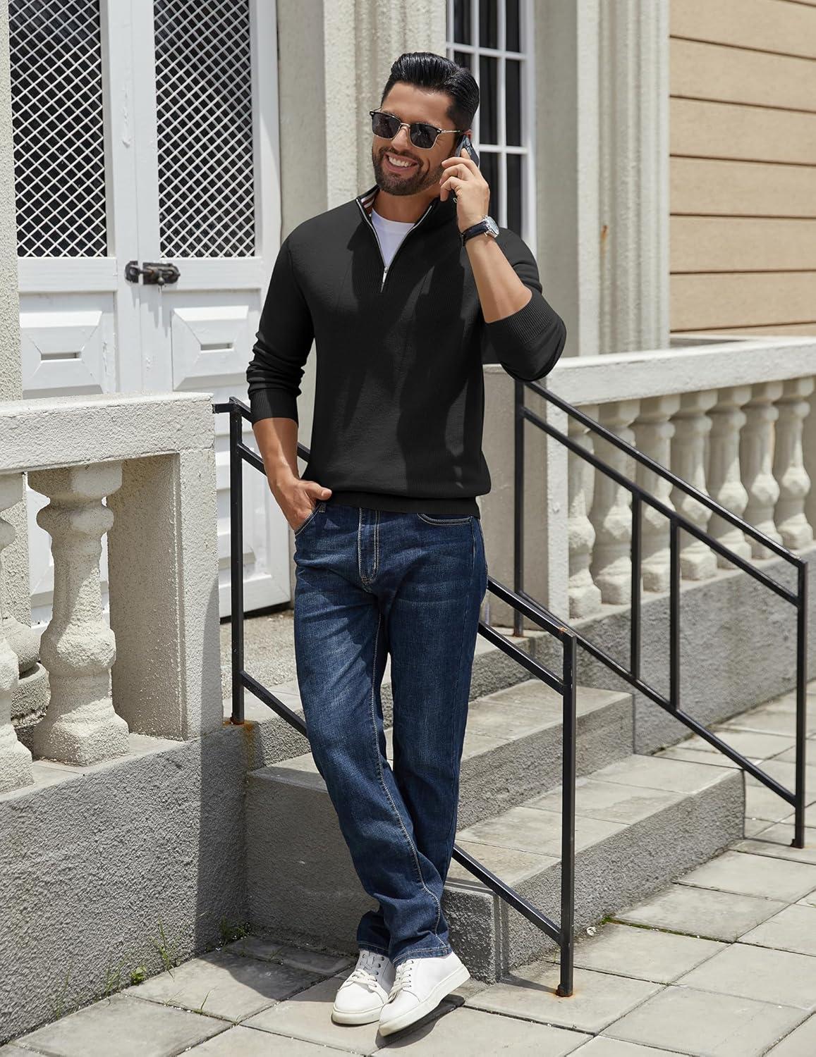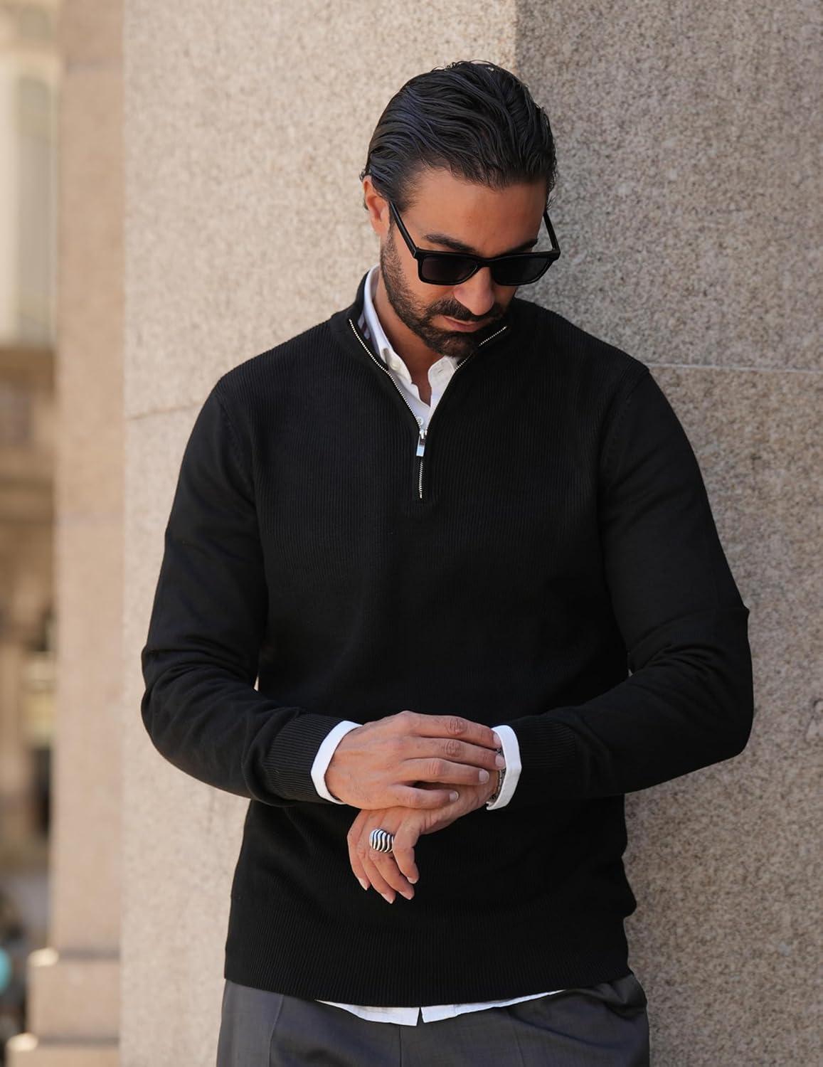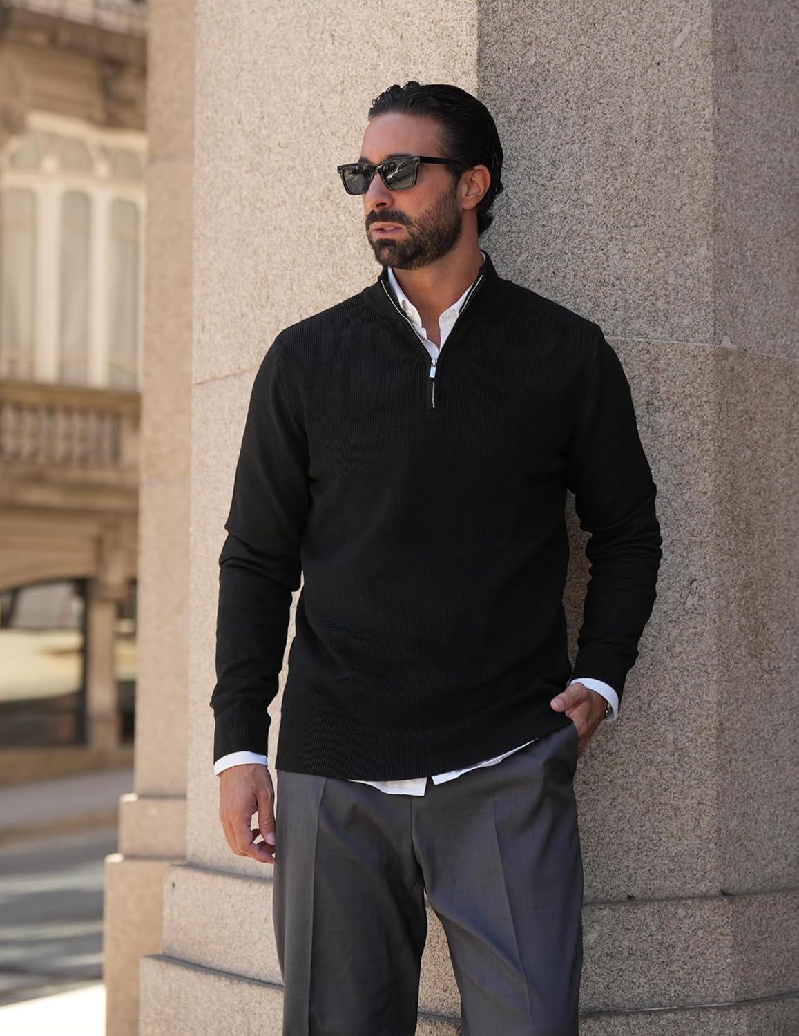 COOFANDY Quarter Zip Pullover Men Slim Fit Stretchy Ribbed 1/4 Zip Sweaters Business Casual Sweater(Black)