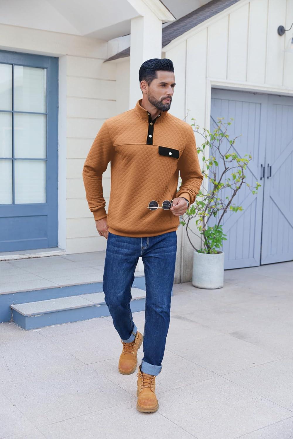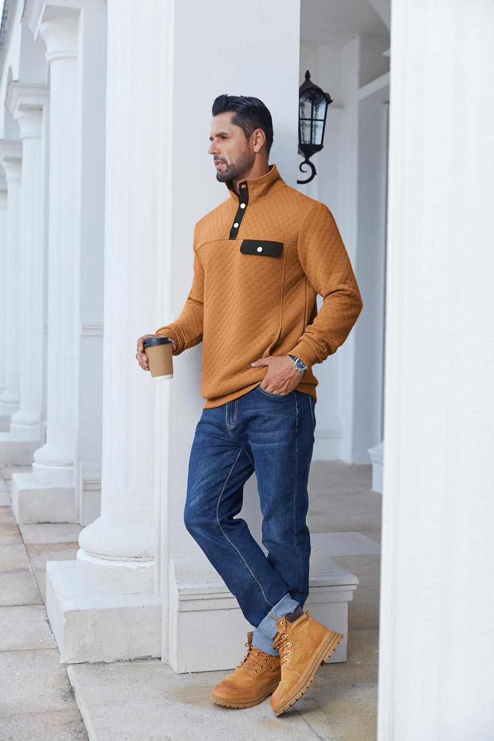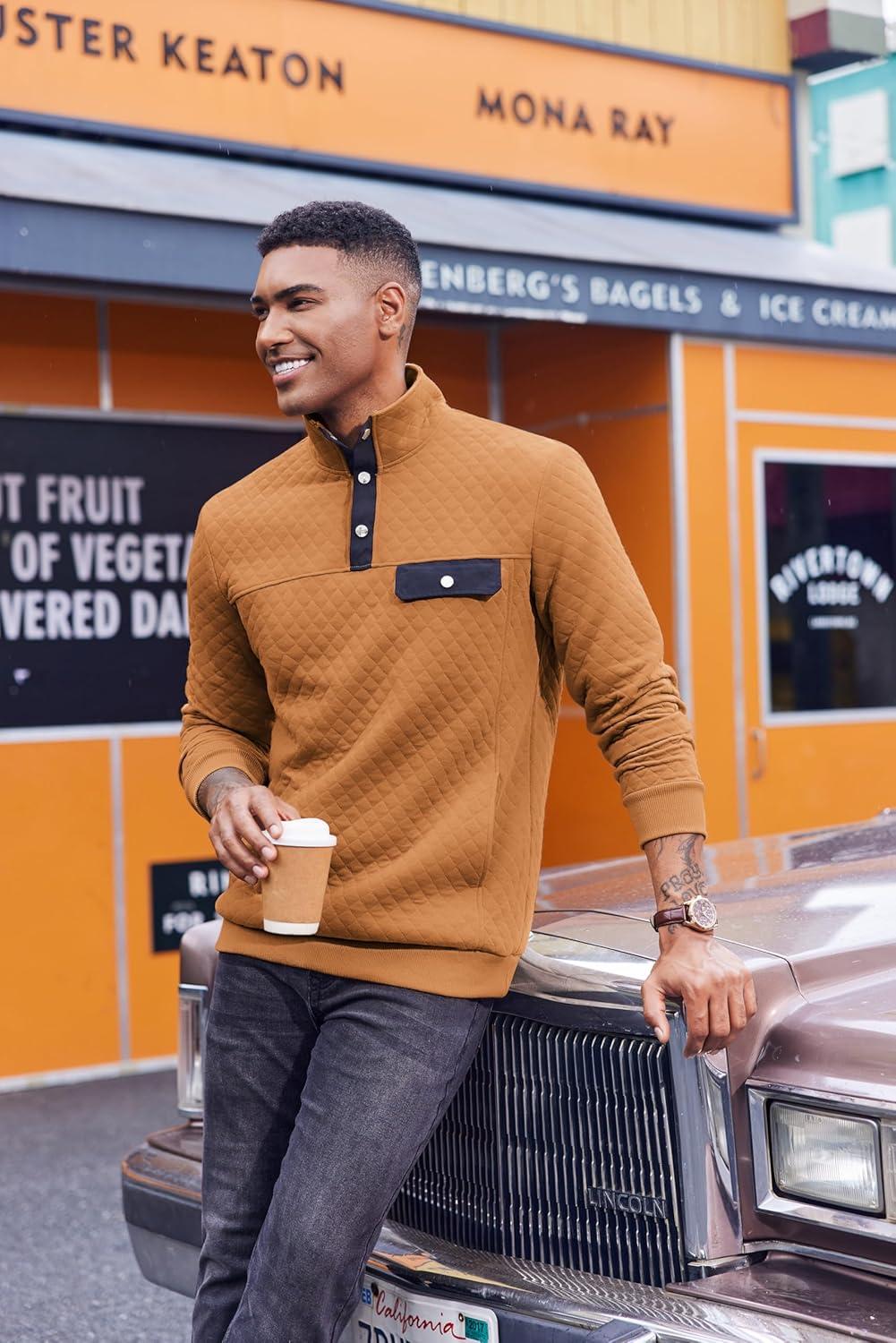 COOFANDY Quilted Sweatshirts for Men Quarter Button Pullover Sweatshirt Stand Collar Outdoor Polo with Pockets(Light Brown)