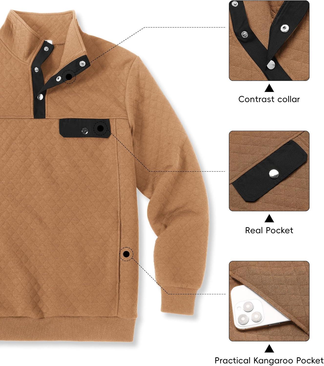 COOFANDY Quilted Sweatshirts for Men Quarter Button Pullover Sweatshirt Stand Collar Outdoor Polo with Pockets(Khaki)