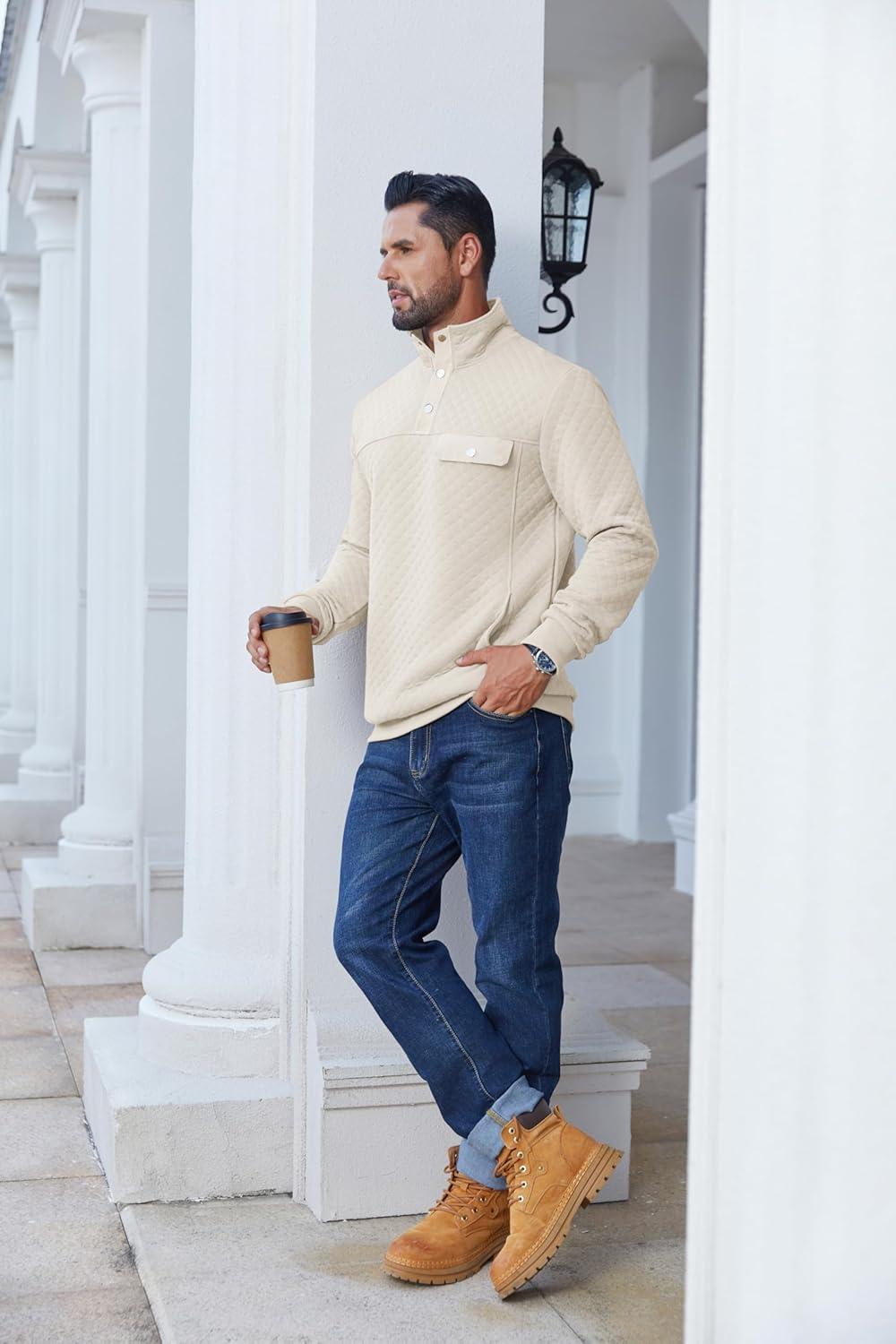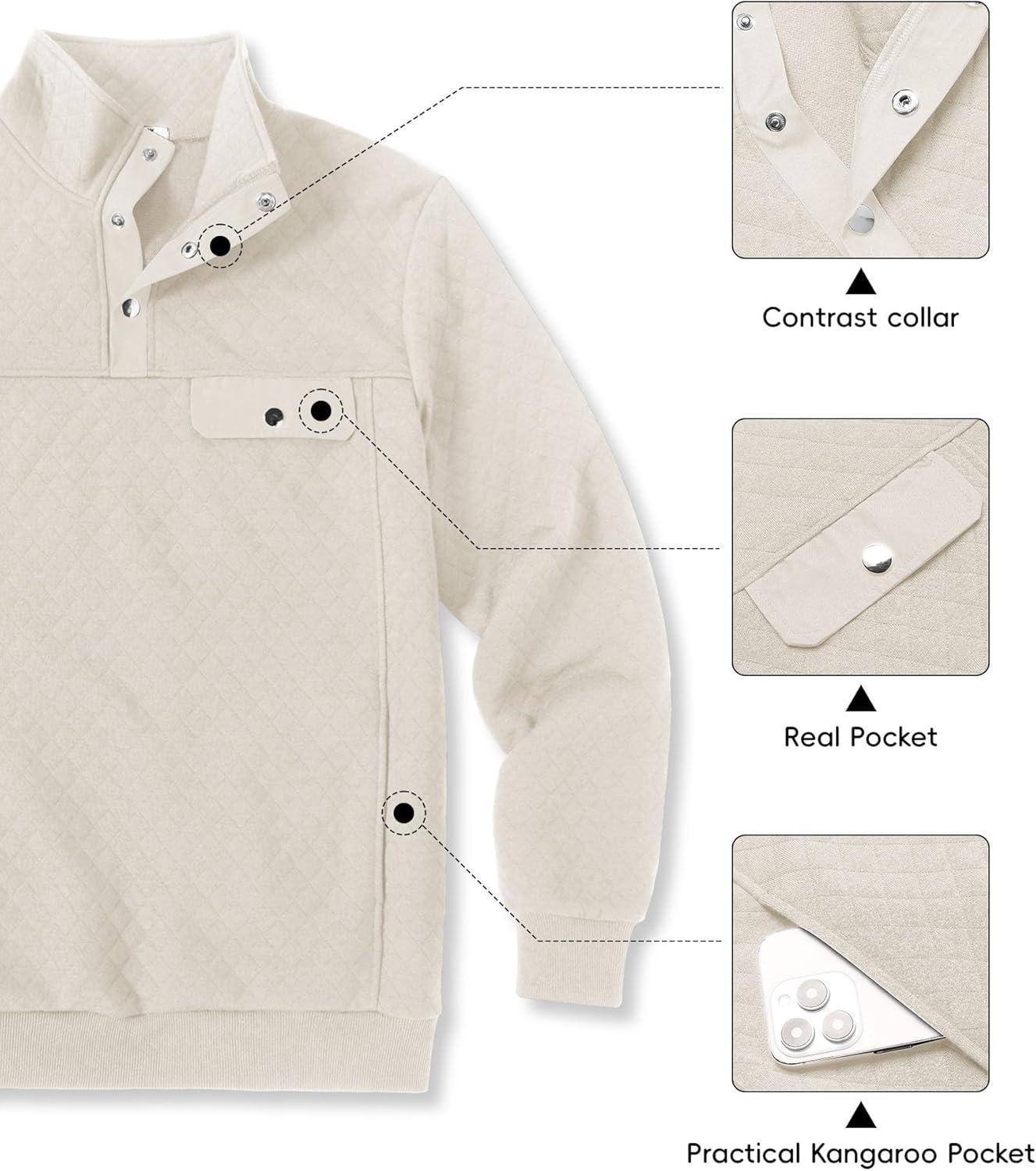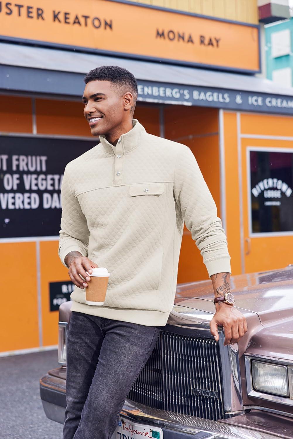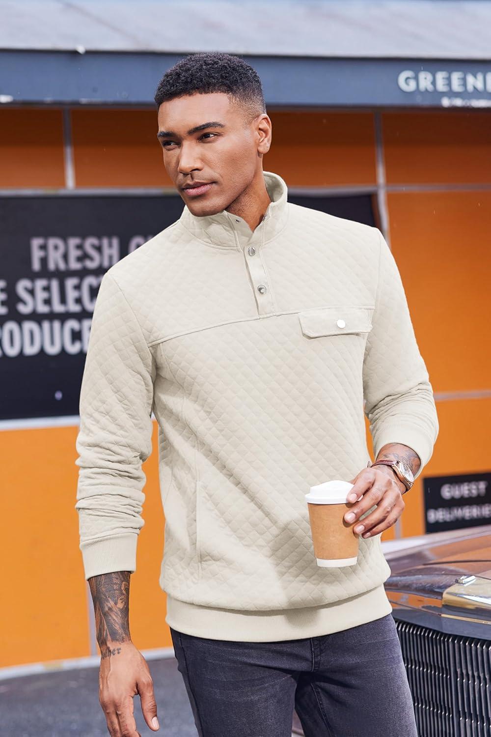 COOFANDY Quilted Sweatshirts for Men Quarter Button Pullover Sweatshirt Stand Collar Outdoor Polo with Pockets(White)