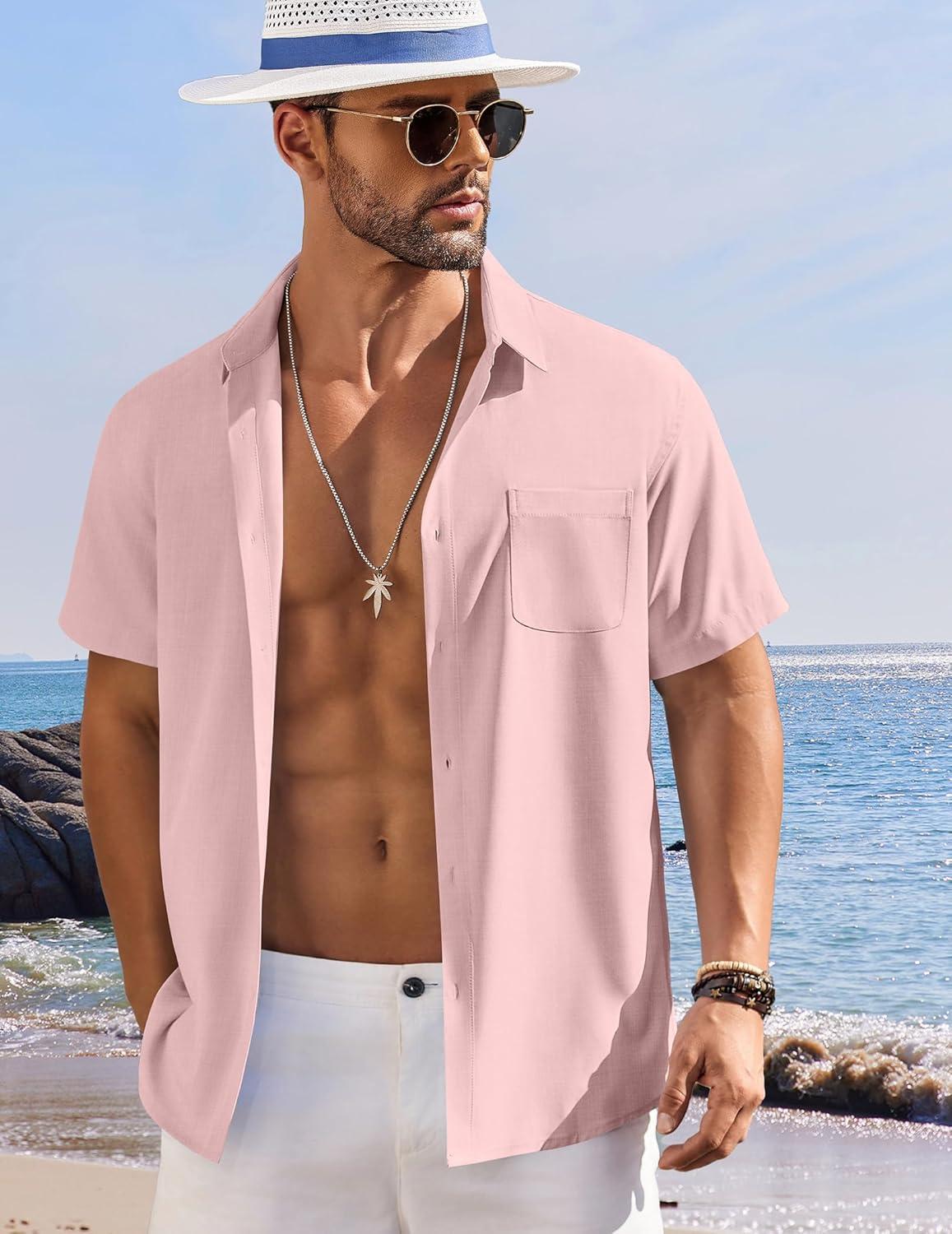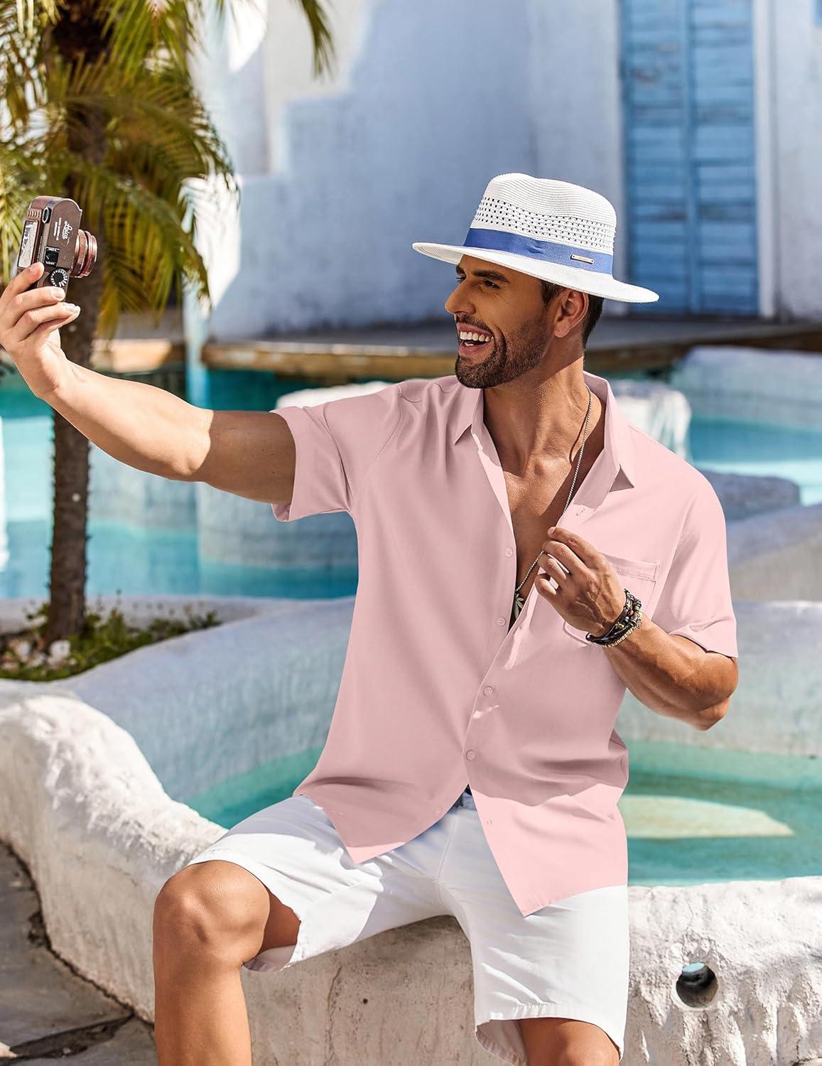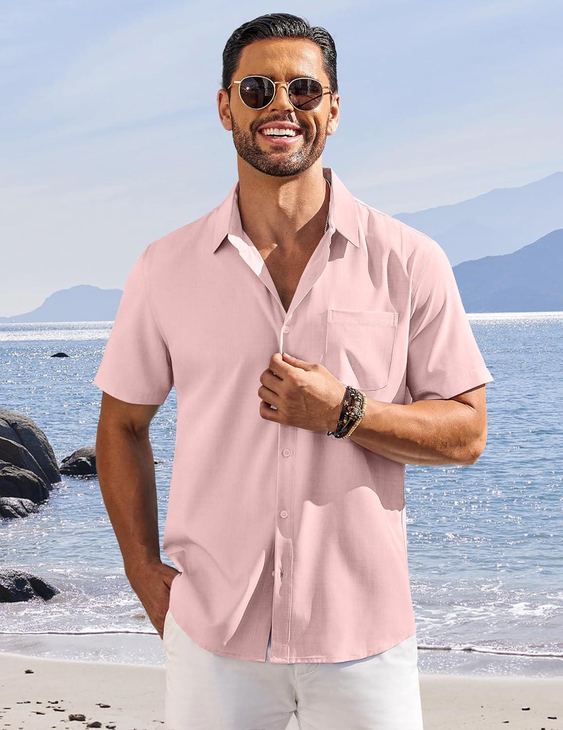 COOFANDY Shirts for Men Short Sleeve Button Down Shirt Casual Summer Beach Shirts(Light Pink)