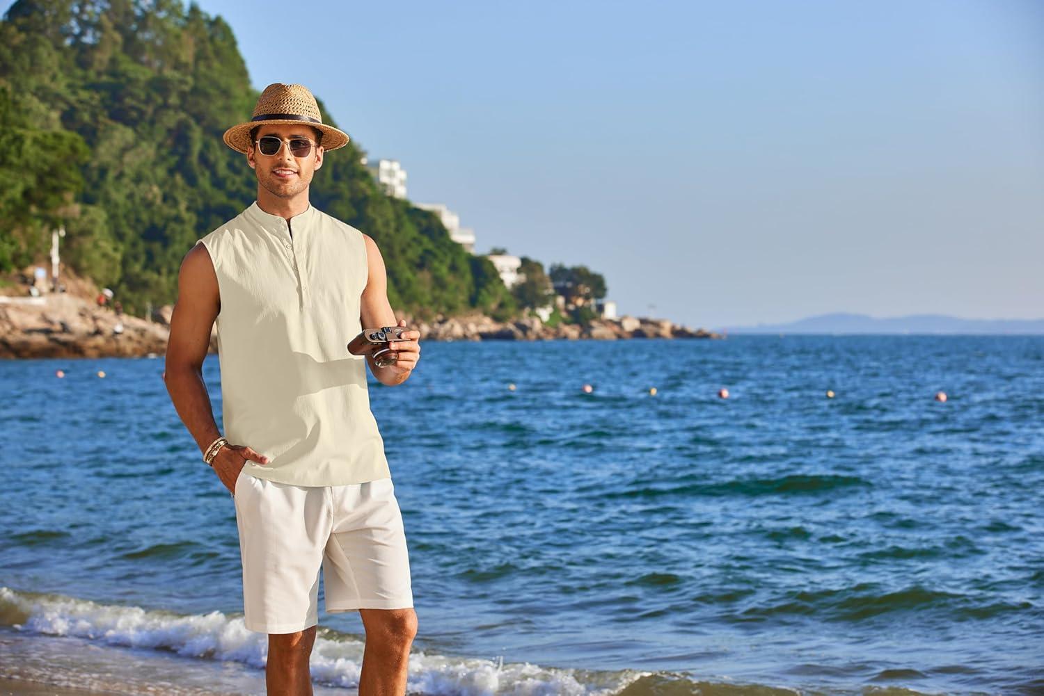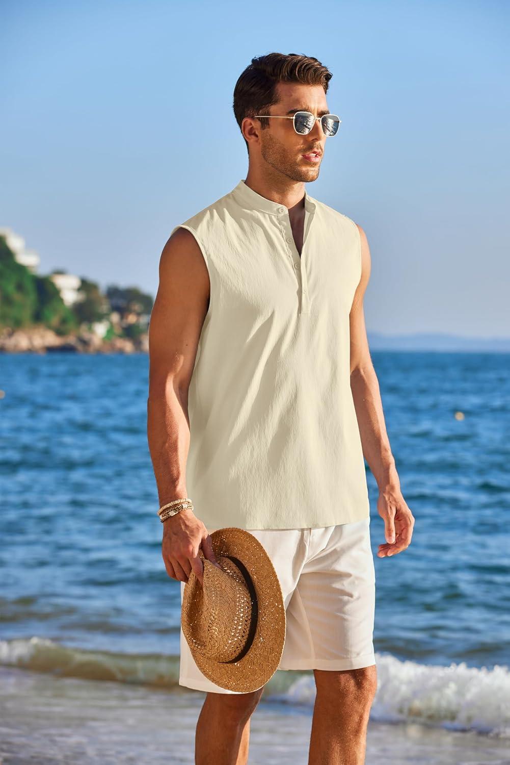 COOFANDY Mens Sleeveless Beach Shirts Casual Tank Tops Summer Button up Henley ShirtsProduct Feature: Sleeveless henley shirts for men, made of soft and comfortable fabric, feature with skin friendly, lightweight, breathable, wrinkle free and no need to iron, which can provide you comfort all the time. Brand: COOFANDY provide casual menswear and best customer experience. Providing Premium Quality, Great fabric for everyday outlook, Stylish design. Main Features:Color:Black, White, Navy Blue, Light Blue, Light Brown, Light GreySeason: Spring,Summer,FallDesign: Men tank top, band collar, solid color, button-down closure, Sleeveless. The sleeveless design allows air to circulate, preventing overheating and ensuring maximum comfort.Fit Style:RegularOccasions:This beach tank top is perfectly suitable for various occasions like beach, wedding, party, vacation, travel, cruises, camping, birthday, festival, lounging, yoga, meditation or daily casual wear. Also, it will be a good gift for your father, brother, boyfriend, husband, son or other male friends.Garment Care: Machine and hand wash are both available for the sleeveless hippie shirts. We recommend to buy one size bigger for loose, comfortable fit.