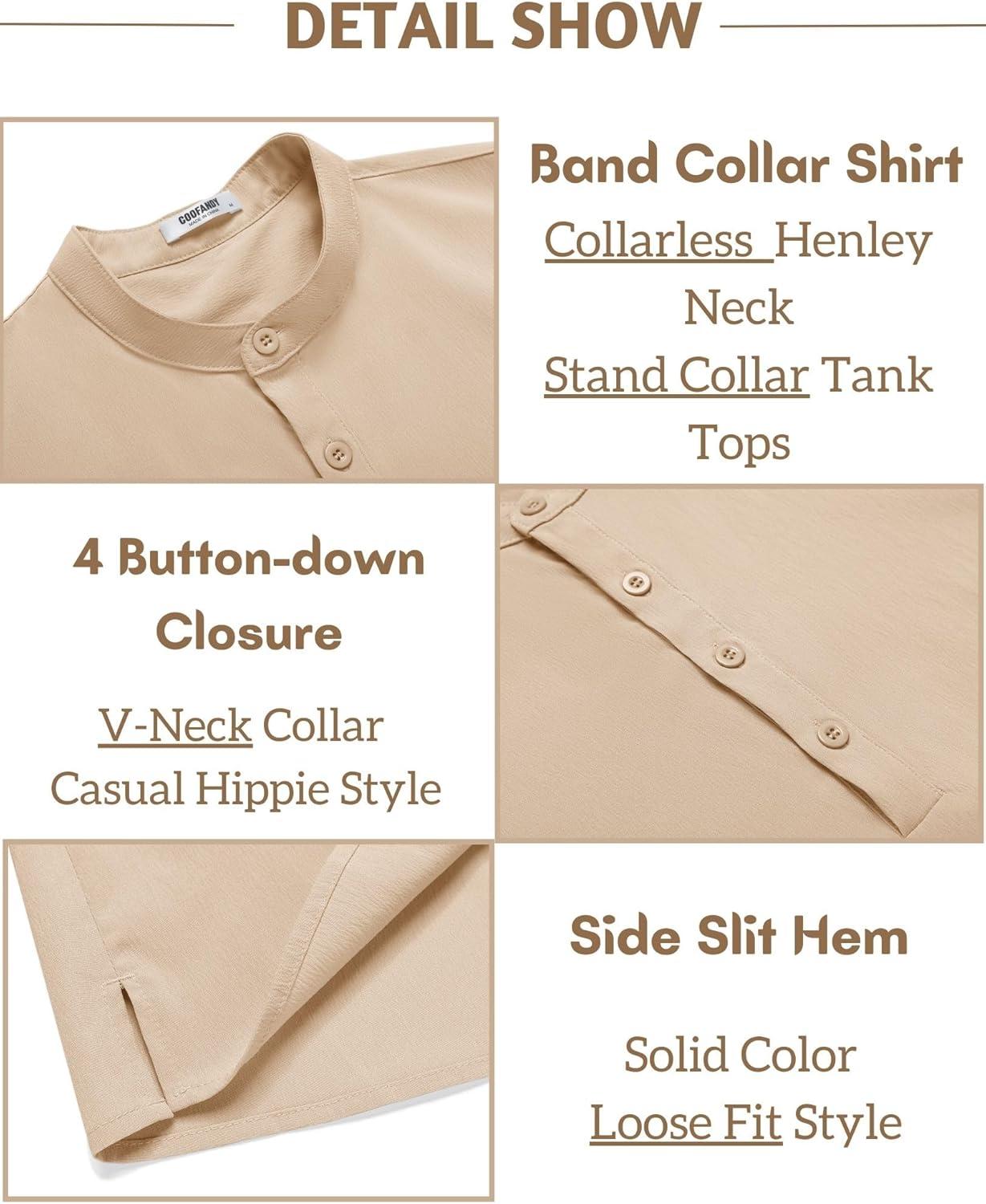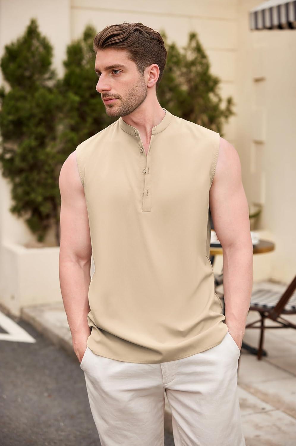COOFANDY Mens Sleeveless Beach Shirts Casual Tank Tops Summer Button up Henley ShirtsProduct Feature: Sleeveless henley shirts for men, made of soft and comfortable fabric, feature with skin friendly, lightweight, breathable, wrinkle free and no need to iron, which can provide you comfort all the time. Brand: COOFANDY provide casual menswear and best customer experience. Providing Premium Quality, Great fabric for everyday outlook, Stylish design. Main Features:Color:Black, White, Navy Blue, Light Blue, Light Brown, Light GreySeason: Spring,Summer,FallDesign: Men tank top, band collar, solid color, button-down closure, Sleeveless. The sleeveless design allows air to circulate, preventing overheating and ensuring maximum comfort.Fit Style:RegularOccasions:This beach tank top is perfectly suitable for various occasions like beach, wedding, party, vacation, travel, cruises, camping, birthday, festival, lounging, yoga, meditation or daily casual wear. Also, it will be a good gift for your father, brother, boyfriend, husband, son or other male friends.Garment Care: Machine and hand wash are both available for the sleeveless hippie shirts. We recommend to buy one size bigger for loose, comfortable fit.