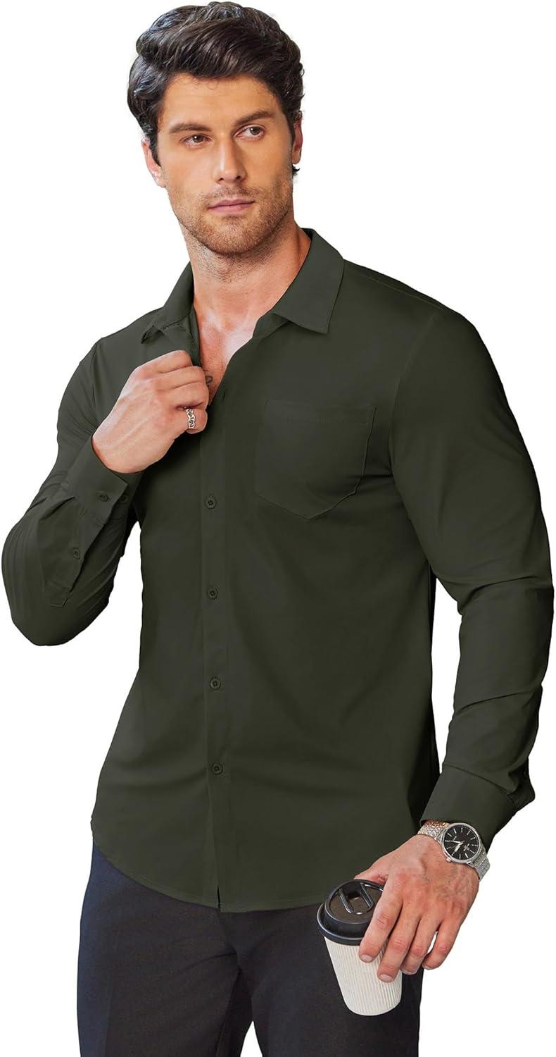 COOFANDY Stretch Mens Dress Shirts Wrinkle Free Long Sleeve Dress Shirt Muscle Fit Button Down Shirt(Olive Green)