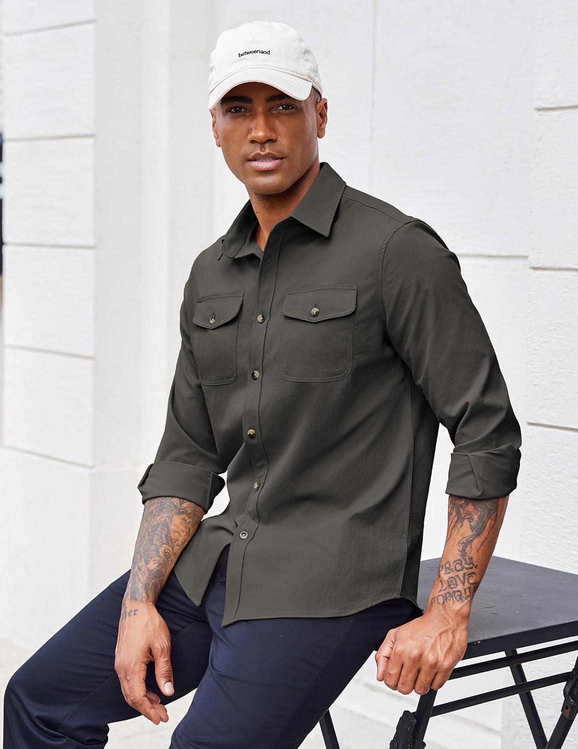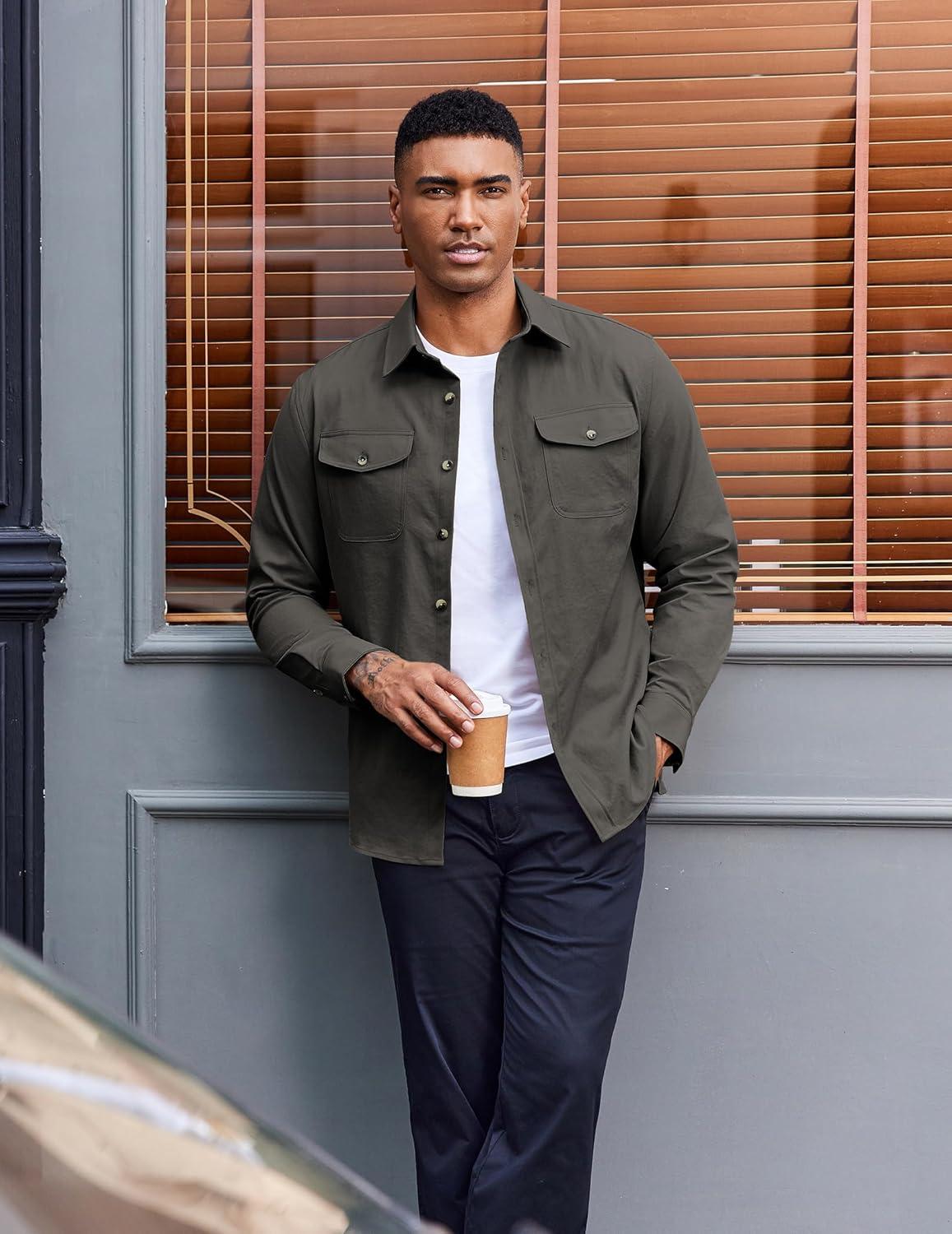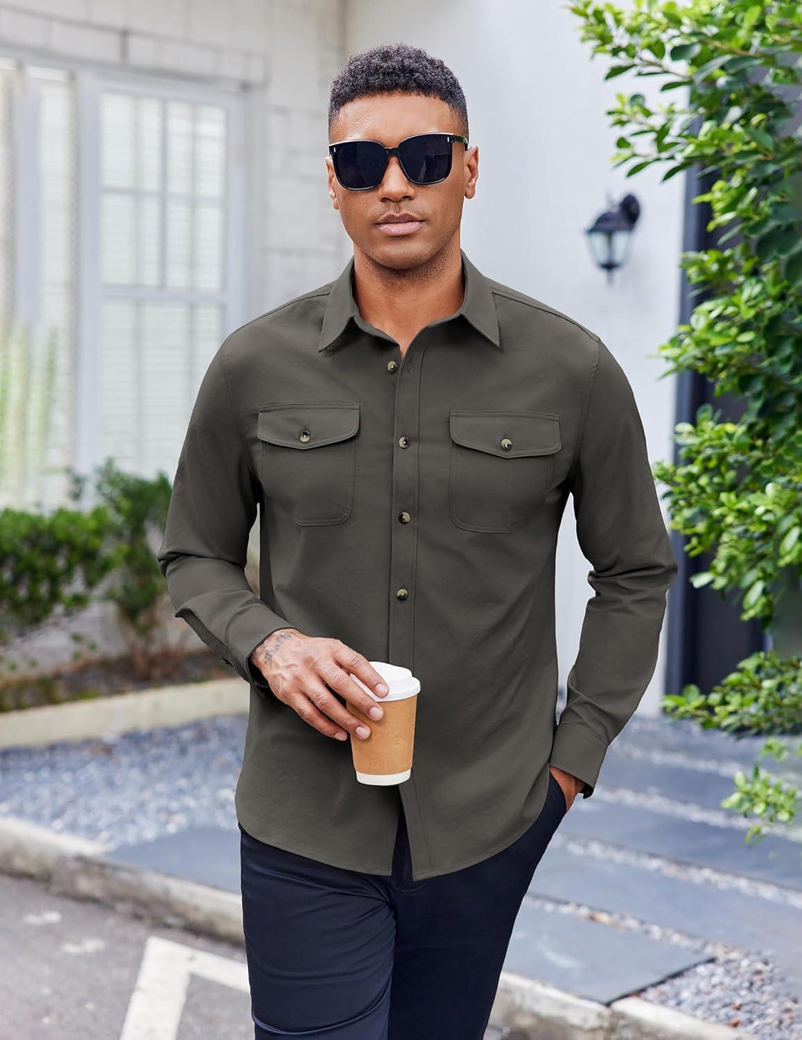 COOFANDY Work Shirts for Mens Long Sleeve Casual Button Down Shirt Mens Shacket with Flap Pockets(Dark Green)