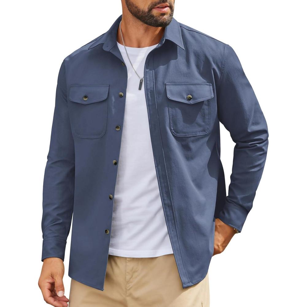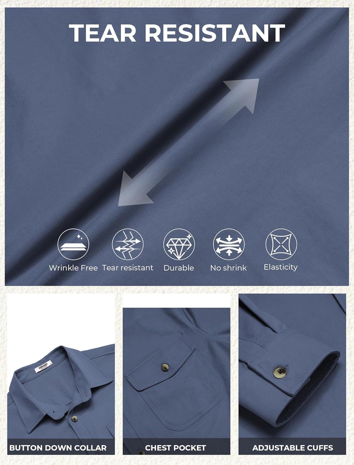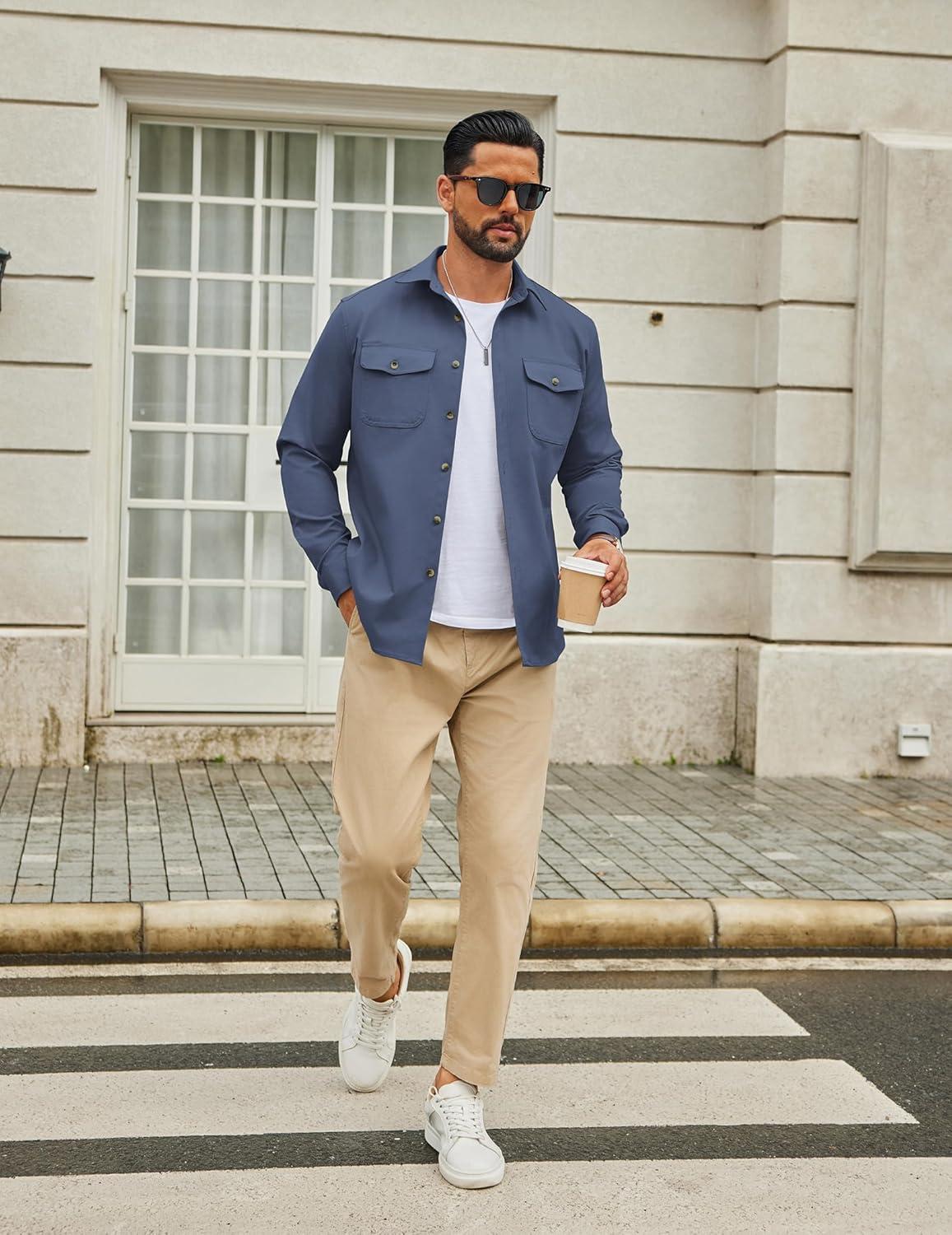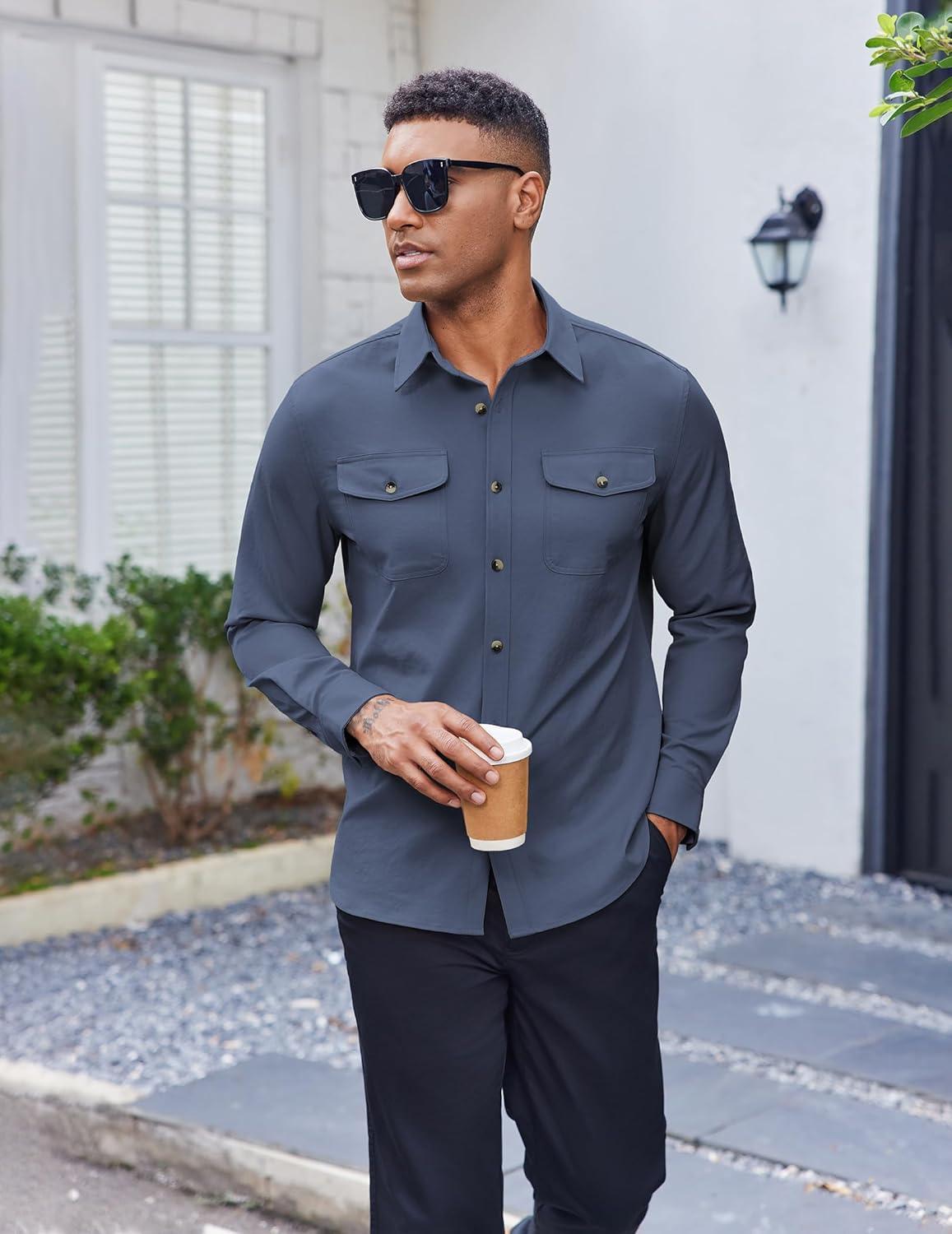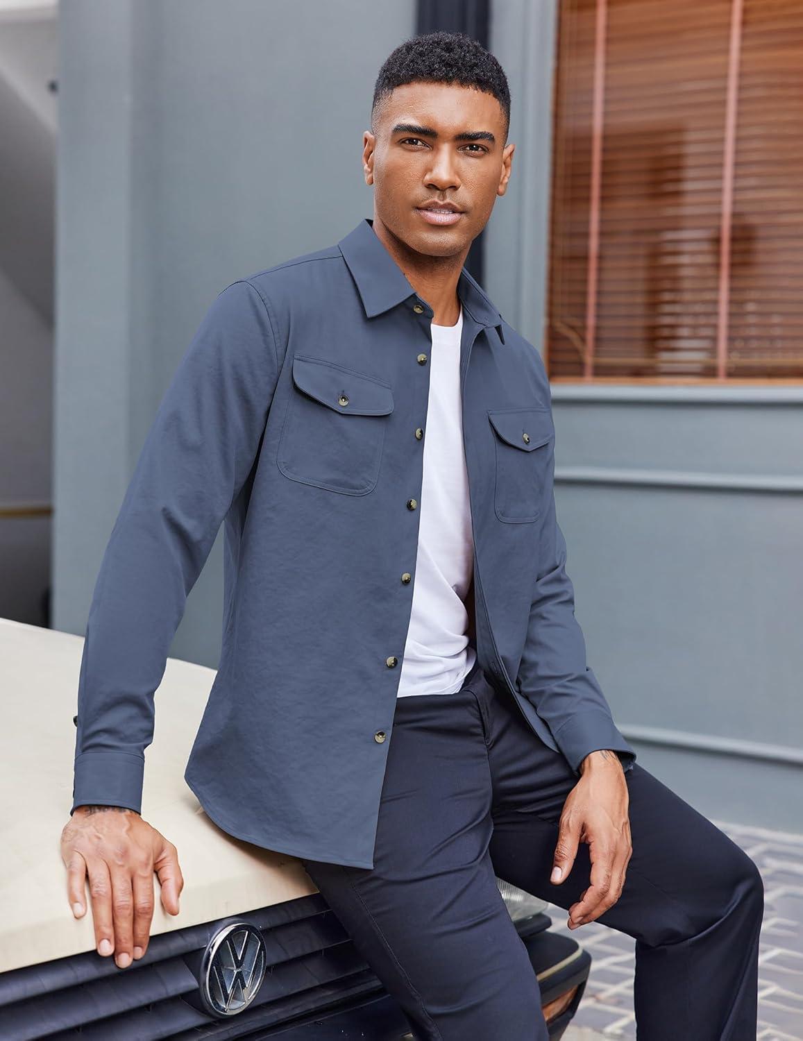 COOFANDY Work Shirts for Mens Long Sleeve Casual Button Down Shirt Mens Shacket with Flap Pockets(Grey Blue)