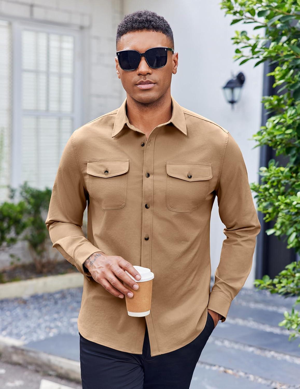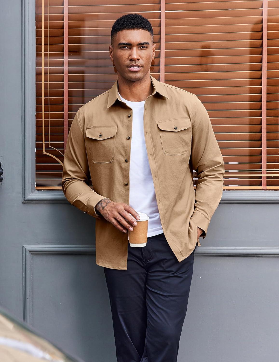 COOFANDY Work Shirts for Mens Long Sleeve Casual Button Down Shirt Mens Shacket with Flap Pockets(Light Brown)